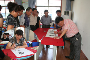 自2003年7月开办的合庆居委老年大学书法班坚持了近10年,受到居民欢迎。每个周一上午的学习课程,20多名老年居民在这里愉快地练习书法。 8月27日上午,是书法班上课的日子,只见书法班的负责人张耀明正在一边讲解,一边进行示范,一会儿的功夫,“天道酬勤”4个苍尽有力的大字展现在学员们面前。据介绍,他还在中国新闻社河南省分社书画研究院举办的纪念井冈山会师80周年书画展中,获得书法金奖。 在这些学员中,年纪最大的80岁,最小的也60出头,他们都没有书法的基础,经过几年的课堂学习和在家锻炼,许多学员的水平得到了提高,在庆祝国庆60周年和庆祝建党90周年的时候,书法班学员的30多幅作品在居民区展出,受到居民们的一致称赞。 为了使老年大学书法班越办越好,合庆居委的领导除了平时关心活动以外,还为他们提供安装了空调的活动室,提供学习用品,安排工作人员负责整理和打扫卫生,使学员们的学习热情越来越高。老年大学书法班同时还得到了镇老龄委的领导关心。