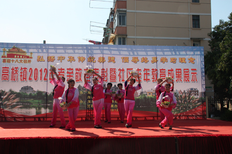 金秋十月,秋风送爽,高桥镇老龄工作委员会和社区教育委员会于10月18日下午在该镇上炼二村门球健身场召开社区老年教育成果展示暨孝亲敬老表彰大会。全镇各居村委相关工作人员及市村民学校老年朋友,早早赶来参加活动。会场北侧的展台上展示着学员们精心制作的刺绣、根雕、盆景等手工艺作品,琳琅满目,美不胜收;广场南侧各居村委绘制的“孝亲敬老文化宣传”黑板报图文并茂,各具特色,令人啧啧称赞;居委会底层大厅和二楼会议室里挂满了书画班学员的书画作品,书画班老师、中国画家协会理事徐文树等老师当场挥毫泼墨,绘画献艺,吸引着一批又一批的爱好者前来观赏学习;展台上展示的自编《浦东高桥地区历史文化》系列乡土教材不时有市民询问何处可以购买…… 高桥镇党委政府十分重视老龄工作,相关领导出席大会并致辞,在欢快的乐曲声中给荣获2012年度孝亲敬老的单位和个人颁奖。各居、村委市村民学校和老年分校文体团队给大家表演的近20个精彩文艺节目赢得全场阵阵掌声和喝彩……预示着高桥镇社区老年教育工作将有新的突破,为建设全民学习终身学习的学习型社会作出新的贡献。