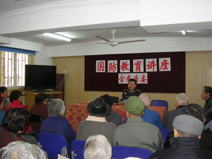 11月26日下午,东明路街道金光居委在活动室举办了一场国防教育知识讲座,邀请了驻沪63680部队的张站长前来主讲。 张站长首先向大家介绍了建国后我国经历的几场战争情况,讲解了当前我国陆疆、海疆的国土防务形势,从政治、军事、经济等各方面分析了国家的安全问题,解读了当今的世界形势和我国与周边国家关系的发展现况。张站长的讲座深入浅出,声情并茂,并例举了大量的故事,牢牢地抓住了每位听众的心。他最后说,随着辽宁号航母的投入使用,以及今年12月中国将告别租用国外的GPS定位系统而全面使用自己的“北斗导”卫星定位导航系统,这些都标志着我国的国防科技实力已取得了重大的进步。