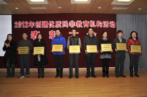 1月24日下午,浦东新区2012年创建优质民非教育机构活动表彰大会在新区青少年活动中心举行。新区教育局职成教处和各教育署职能部门的领导,以及各民非教育机构负责人等100多人出席。 会上,申信信息技术专修学院院长黄国兴、未来教育培训中心校长童慧芬、恒星艺术文化进修学校校长姚敏作了交流发言;新区成教协会秘书长张萍宣读了《关于表彰浦东新区2012年创建优质民非教育机构活动先进单位的决定》。